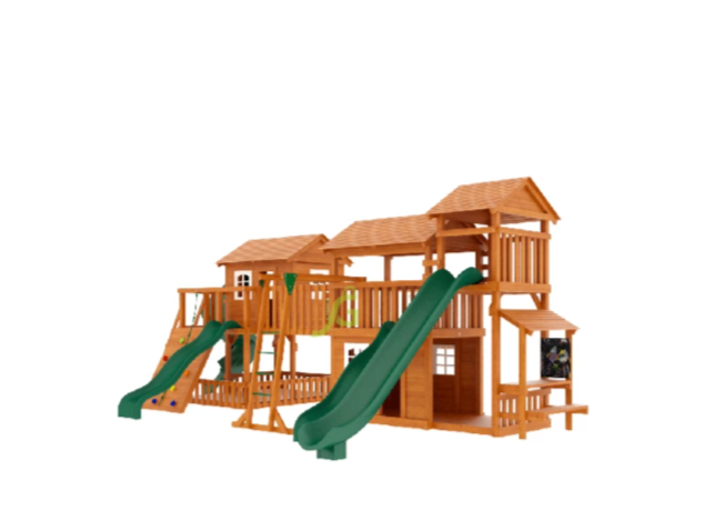 Просто огромный комплекс для детей красиво впишется в ландшафт загородного дома, его стильные башенки с белыми окошками на фоне сочной зелени украсят ваш сад. А самое главное, множество развлечений надолго отвлекут детей от вредных гаджетов, позволят выманить малышей-домоседов на свежий воздух. Разнообразные спортивные снаряды гарантированно будут воздействовать на все группы мышц мальчишек и девчонок. Ведь в площадке есть рукоход, скалодром, канат, лестницы и 4 горки для самых отважных. А для романтичных принцесс и творческих натур предусмотрены разного вида качели, доска для рисования, игра «крести-нолики» и игровой прилавок.