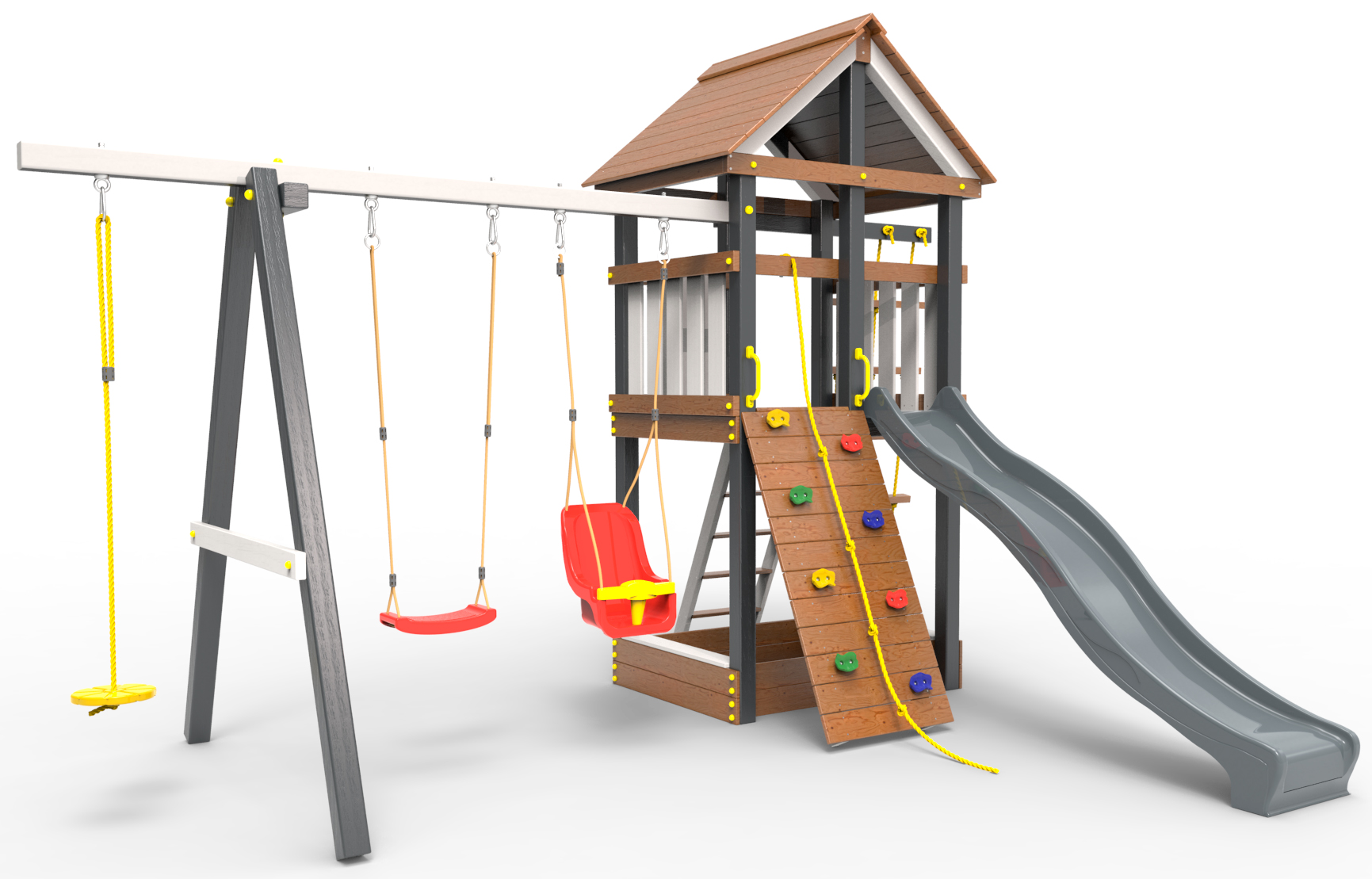 Обращаем Ваше внимание, что фактический цвет детской площадки может отличаться от представленных фото на сайте. Специфика окраски нетоксичными пропитками и красителями допускает отклонения в цветовой гамме отгружаемых изделий. Также обратите внимание, что фактический цвет может отличаться из-за цветопередачи устройства на котором Вы смотрите фото.