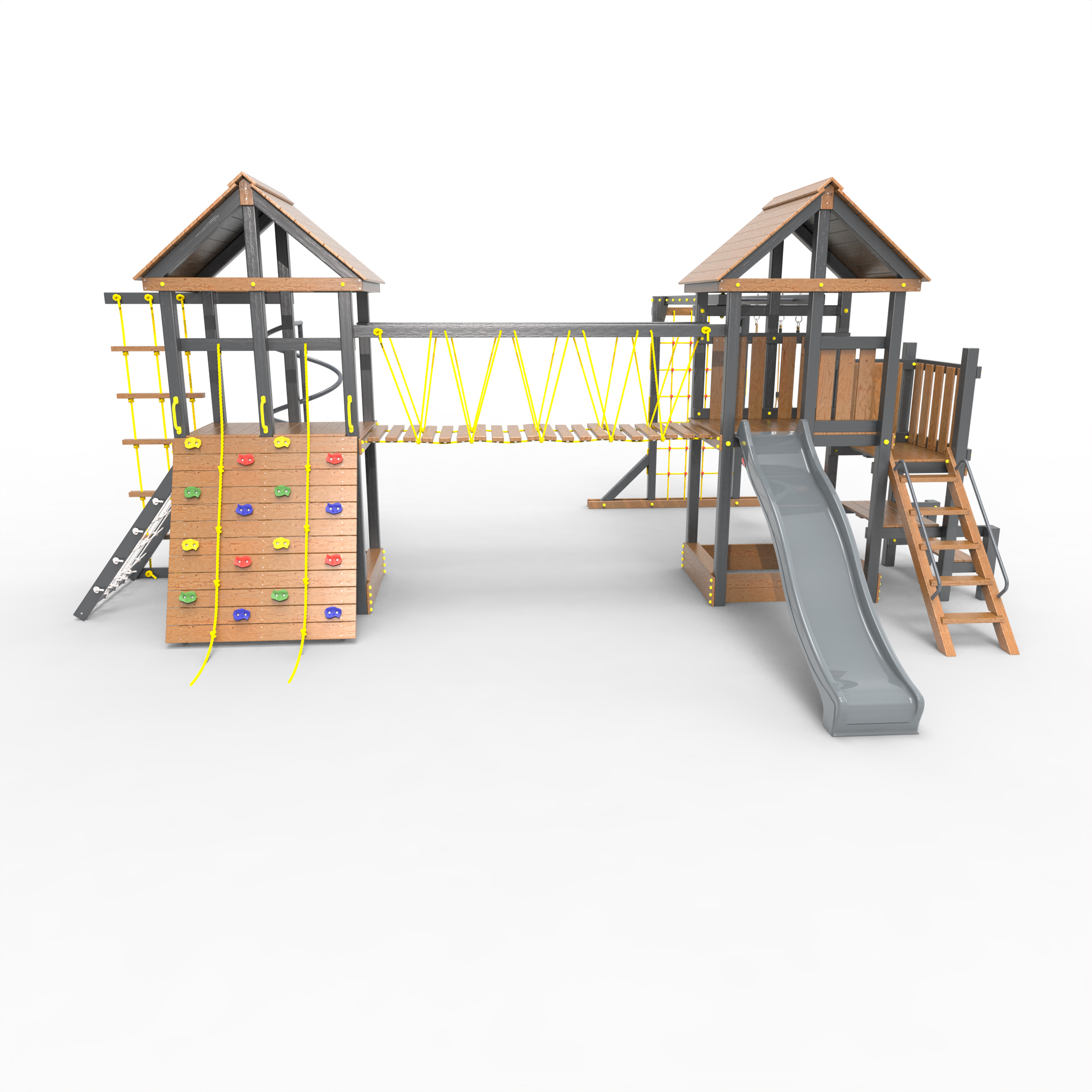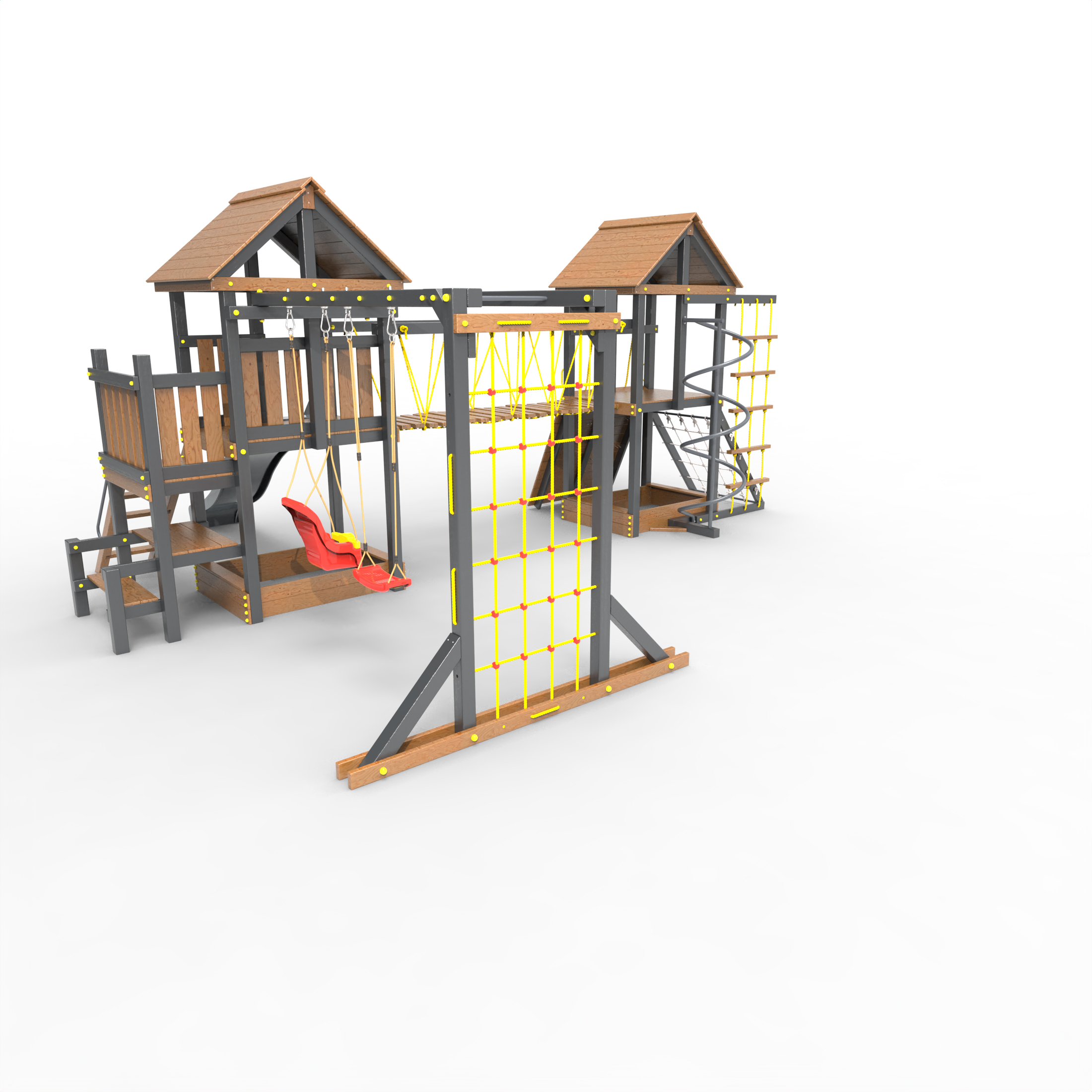 Обращаем Ваше внимание, что фактический цвет детской площадки может отличаться от представленных фото на сайте. Специфика окраски нетоксичными пропитками и красителями допускает отклонения в цветовой гамме отгружаемых изделий. Также обратите внимание, что фактический цвет может отличаться из-за цветопередачи устройства на котором Вы смотрите фото. Производитель оставляет за собой право менять цвет отдельных деталей и комплектующих(включая пластик, канаты и пр.), при этом сохраняя весь функционал и характеристики товара.