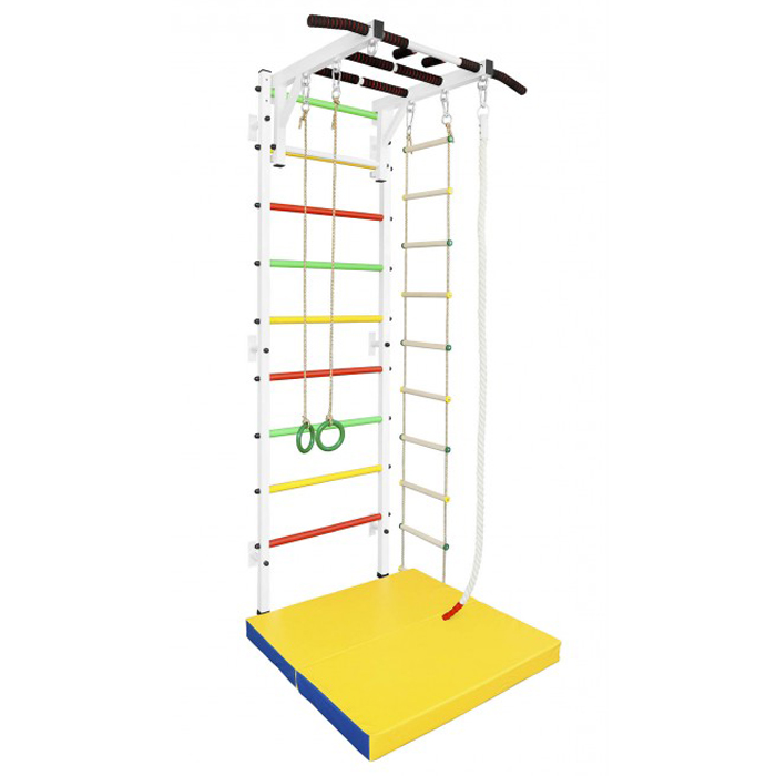 - Школьникам (как младшей, так и средней школы), подойдут варианты на основе шведской стенки с турником. Такую модель можно дополнить доской для пресса, канатом.