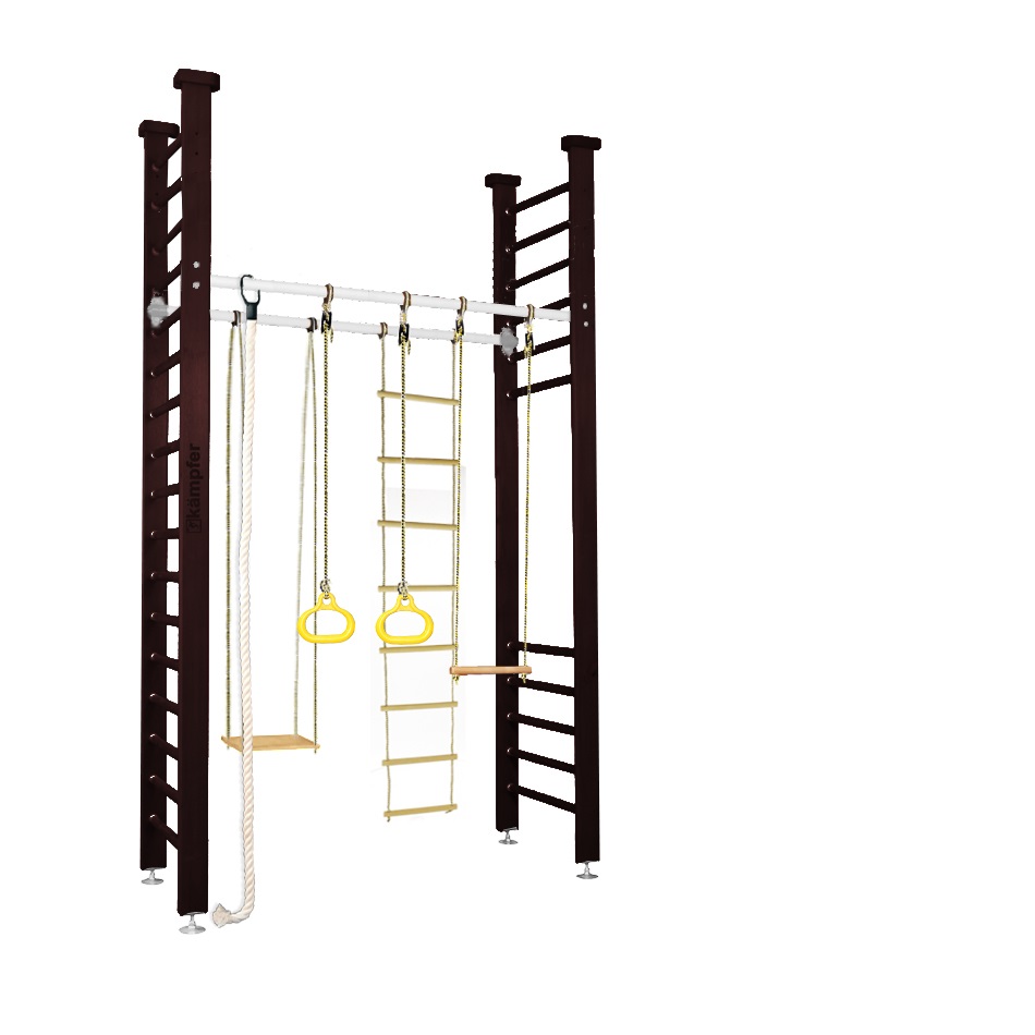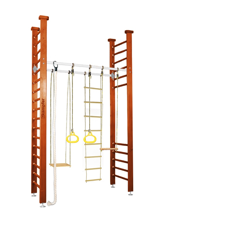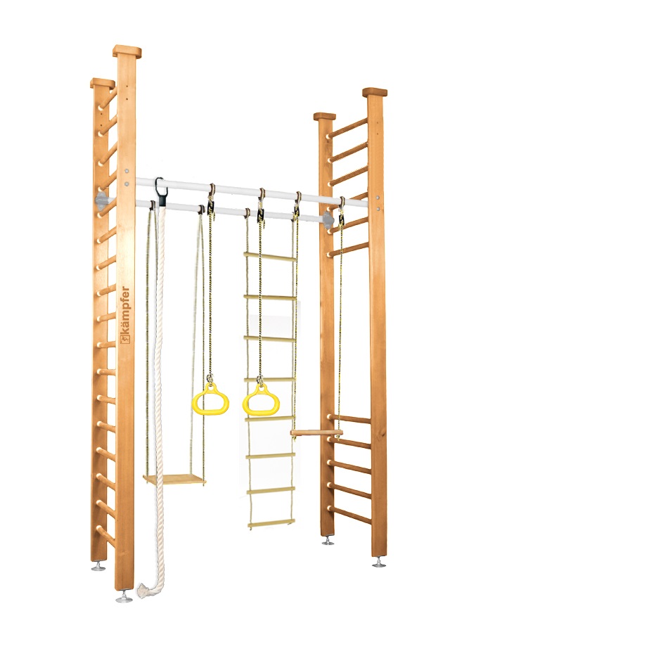 Конструкция выполнена из натурального дерева стойки и ступени, все края деталей немного скруглены обеспечивая большую безопасность для ребенка. Перекладины для навесного оборудования -металлические.
