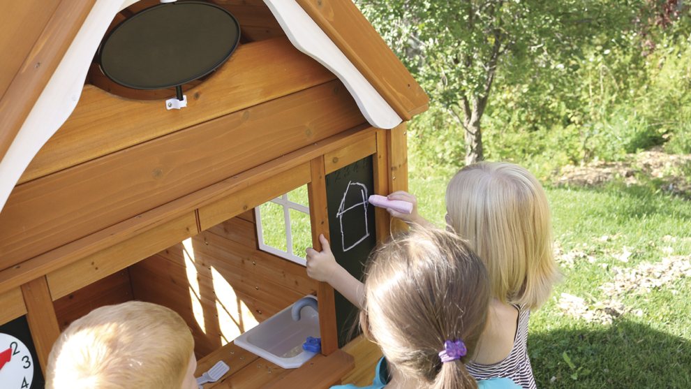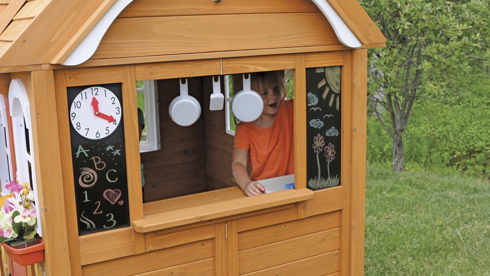 Игровая кухня является идеальным местом для творчества и кулинарии благодаря раковине, плите и кухонной утвари. В игровом домике есть две двойные доски для рисования мелом, часы, а также почтовый ящик и игровой телефон.