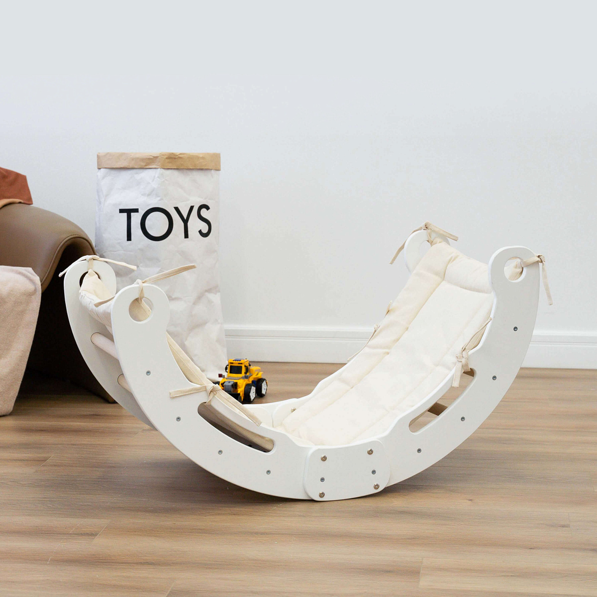 Второй способ — перевернуть арку так, чтобы она стала качелями, которые разнообразят досуг и станут любимым местом для отдыха и расслабления. Качание расслабляет, быстро успокаивает и переключает детей с активных игр на отдых.