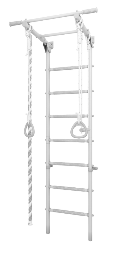 Пастельный цвет ступеней гармонично сочетается с серым корпусом, спортивный уголок стильно выглядит в любом интерьере.