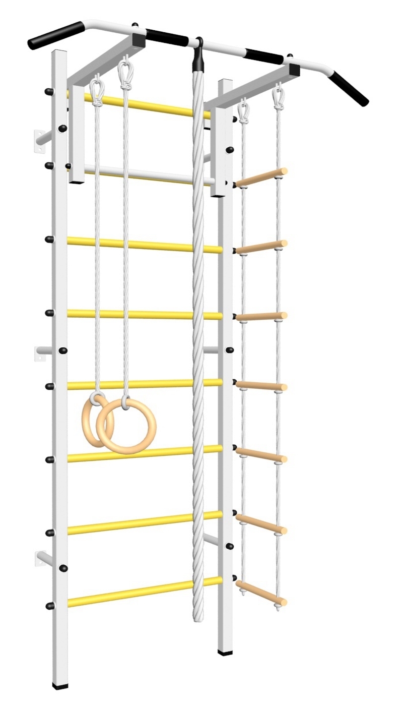 Стойки шведской стенки Sv Sport усиленные изготовлены из профильной трубы 60 х 40 х 2 мм. Ступени изготовлены из круглой, стальной трубы, покрытой резиной (не скользят, не натирают мозоли, не прокручиваются, не имеют запаха, приятны на ощупь). Устанавливается к стене при помощи 6 кронштейнов. На перекладину, в местах хватов, одеты резиновые ручки.