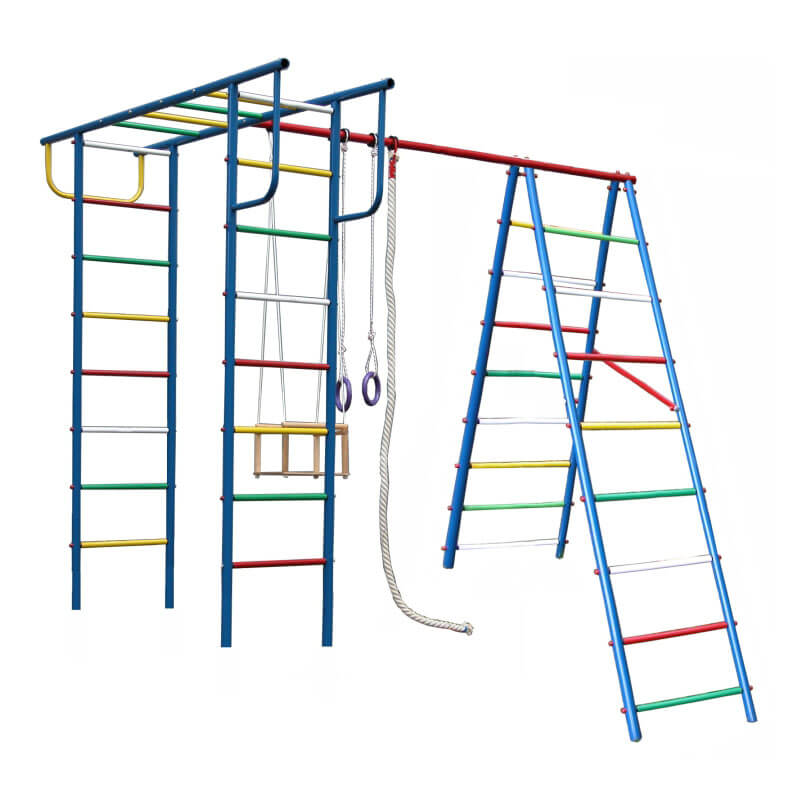 Спортивный комплекс представляет собой сборно-разборную металлическую конструкцию, легко монтируется и демонтируется на зиму. Устанавливается путем бетонирования опор. Расцветка: стойки – синие/красные, ступени - разноцветные.