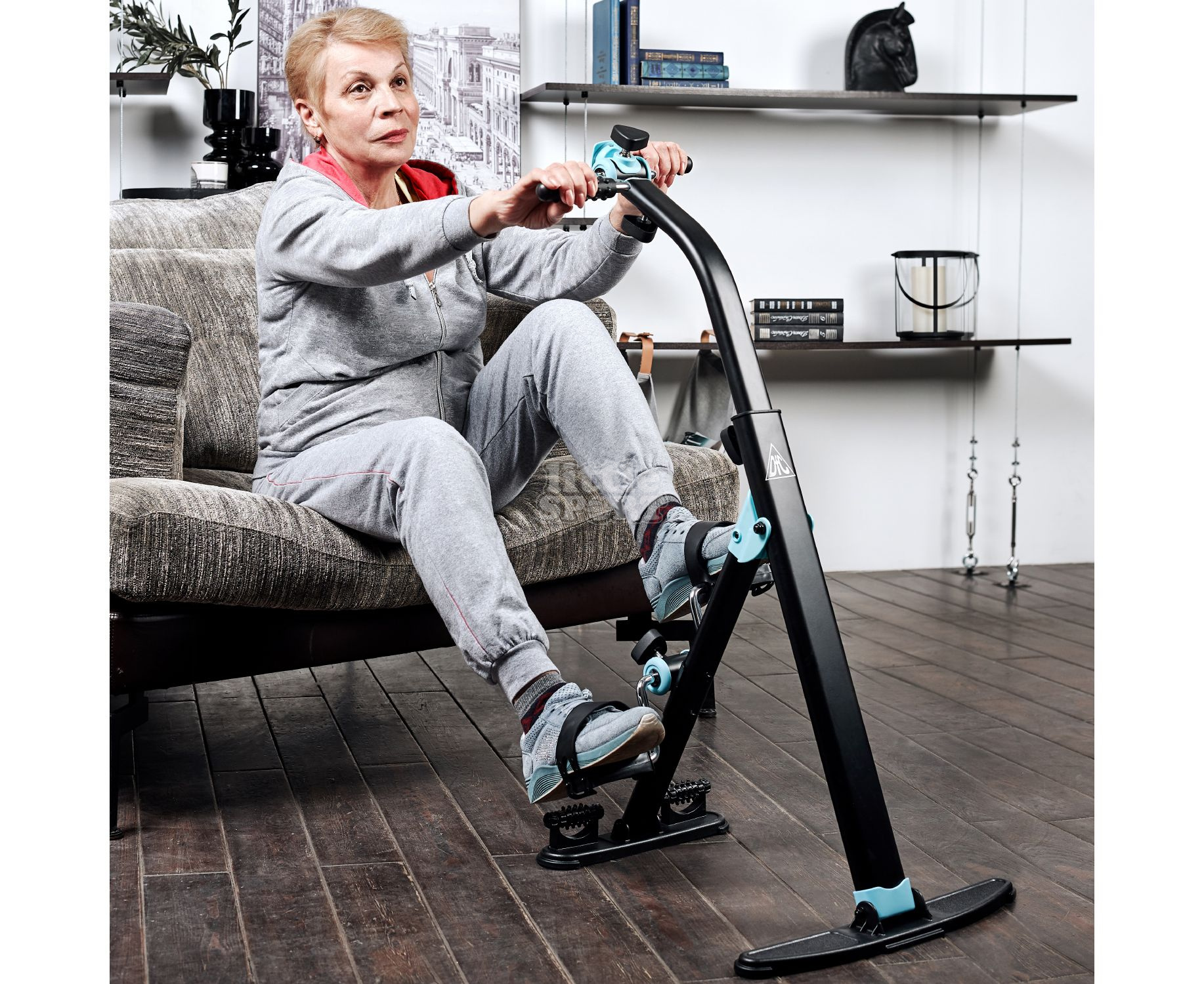 В основании тренажёра предусмотрены ролики с пупырчатой поверхностью для массажа ног. Такими же накладками оснащены рукоятки.